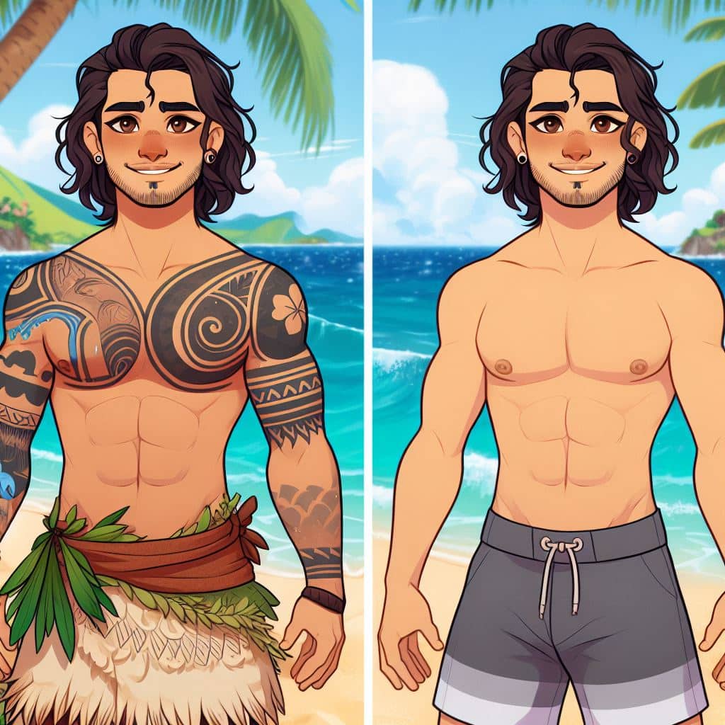 Weird that the AI gave the Moana (or Kai) in the first image a girdle. The second one, though, is similar to how I imagine Disney’s design. That is if the company ever gets the guts to make such a film and cover such issues.