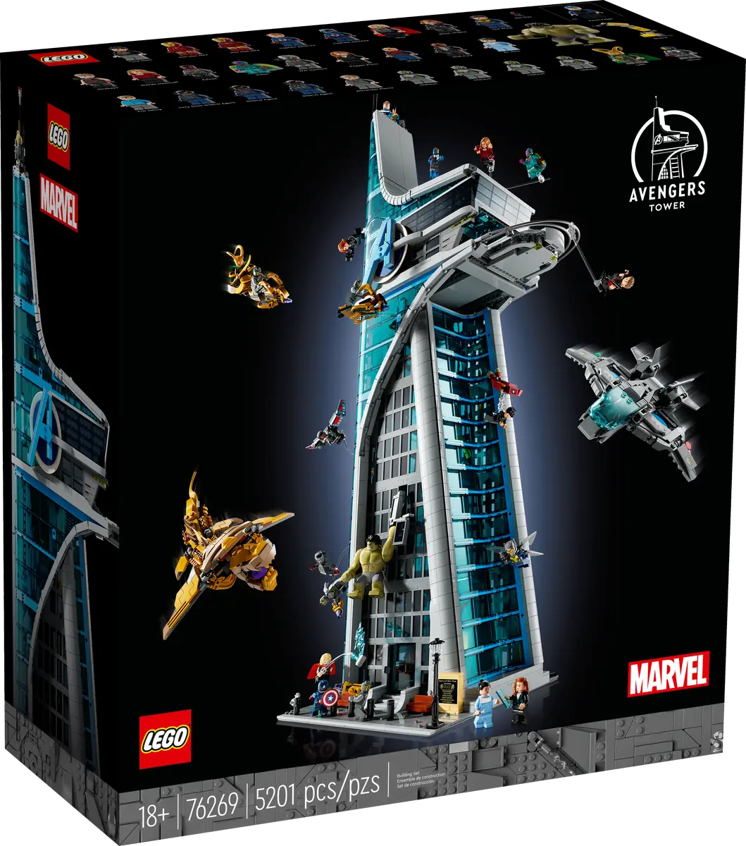 “Capture the heroic style and scale of the most iconic building in the Avengers Universe with the 5,201-piece Avengers Tower. Standing over 35.5 in. (90 cm) tall, this monumental set is more than just an impressive display piece. It’s filled with ways to replay Infinity Saga battles alongside an all-star cast of 31 figures.“
