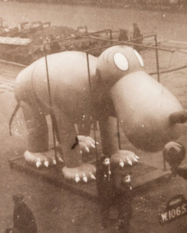 Donald’s 1935 balloon sported the skinny neck, plump body, and long beak of his cartoon appearance. Unfortunately, an extreme amount of rain caused Donald’s neck to give way, resulting in his head and neck struggling to stay afloat. The balloon was retired after its only appearance.