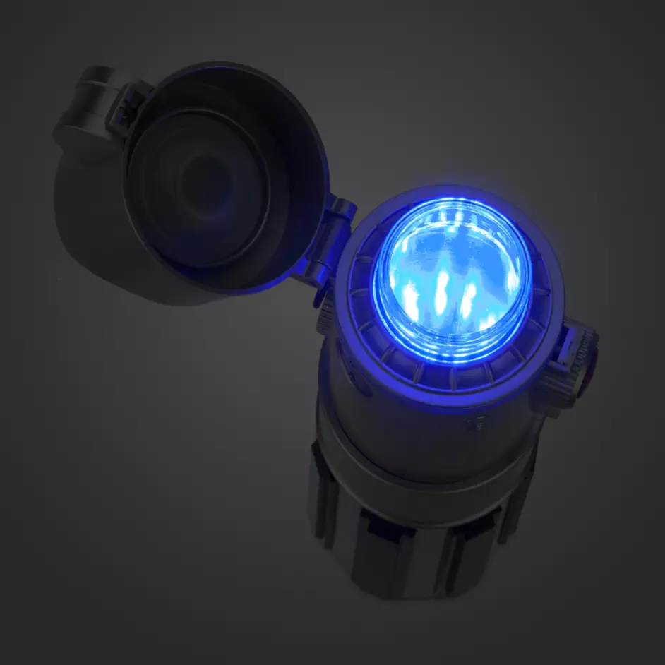 The water bottle holds 12.7 oz and is powered by two CR2032 button cell batteries. It has a wrist strap based on the A New Hope version of the Jedi’s weapon.