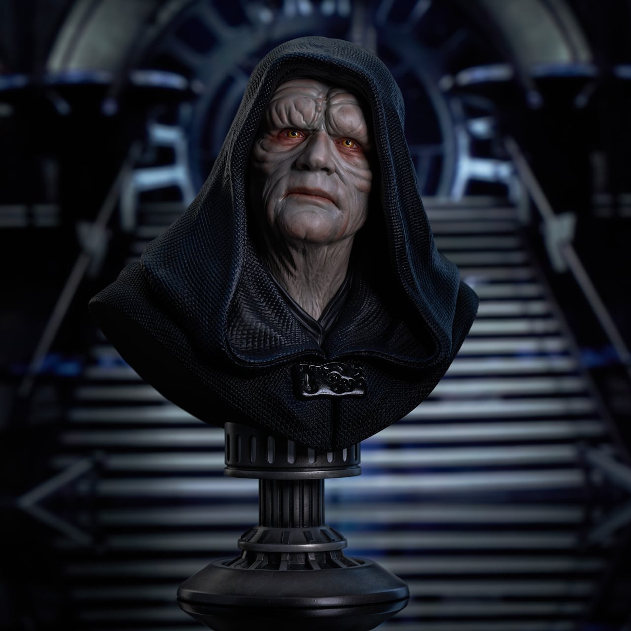 “This Sith Lord is a legend in the Star Wars universe, and now he’s a Legend in 3D! This detailed ½ scale portrait of the man behind the formation of the Empire and the destruction of the Jedi order measures approximately 10 inches tall and sits atop a Death Star-themed base.”