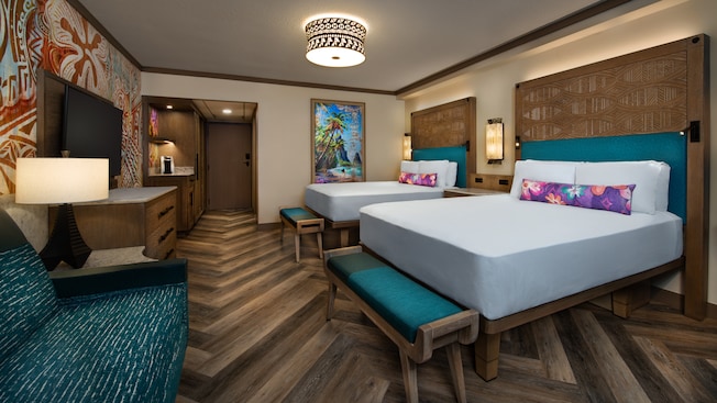 The spacious accommodations at Disney’s Polynesian Resort are designed to provide both comfort and an immersive island-inspired experience. From the vibrant color palettes to the rich wood finishes, every detail contributes to the resort’s signature tropical aesthetic. The Bungalows, in particular, elevate this experience with their expansive layouts and private decks, offering a seamless connection between indoor luxury and outdoor serenity.