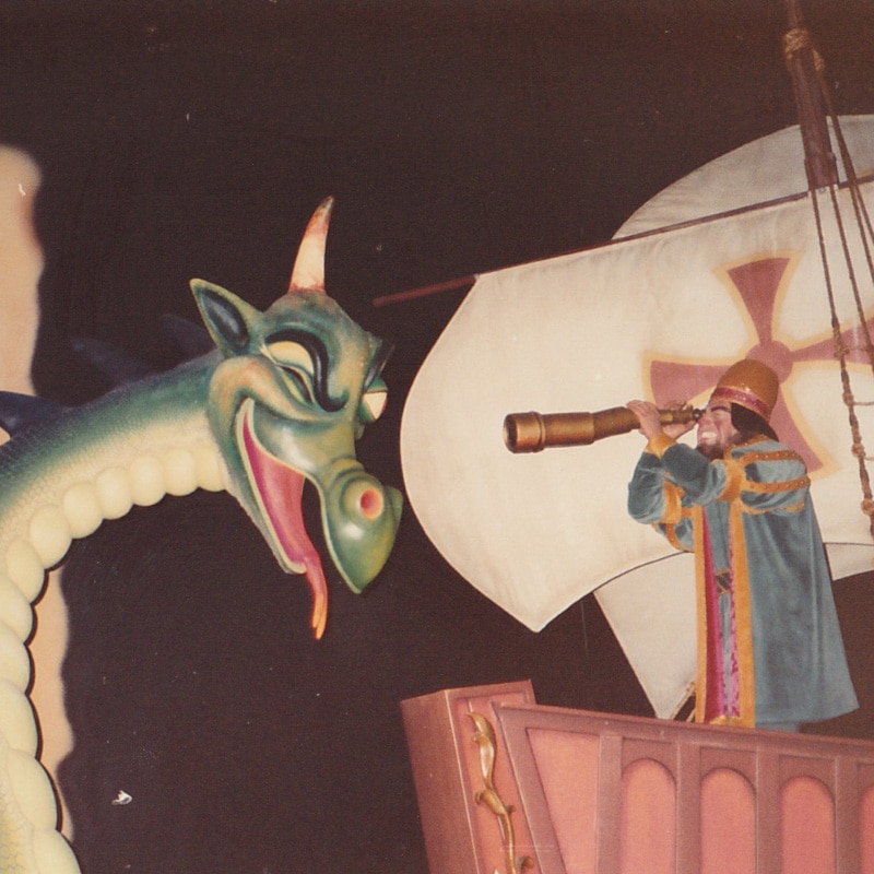 We’ll kick things off with a favorite character of Geeky Sparkles and myself, Figment. The mascot of EPCOT is still present within the parks, but not as much as it was in the ’80s and ’90s. Before Journey into Imagination was disastrously remodeled, the purple dragon and Dreamfinder roamed the area just outside the show building.